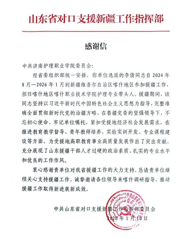近日,山东省对口支援新疆工作指挥部向学院发来感谢信,对学院在援疆工作的大力支持表示衷心感谢,并对学院选派的援疆教师李倩同志的卓越表