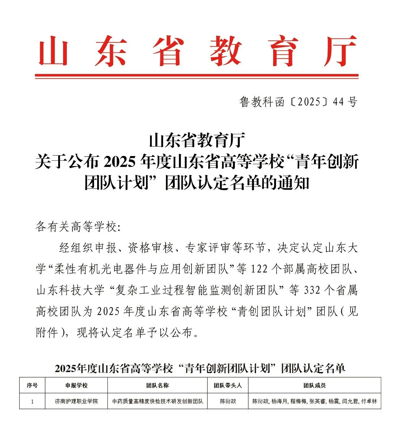 近日,山东省教育厅公布了2025年度高等学校青创科技计划创新团队认定名单。由济南护理职业学院药学系陈衍政博士作为带头人的中药质量高精度