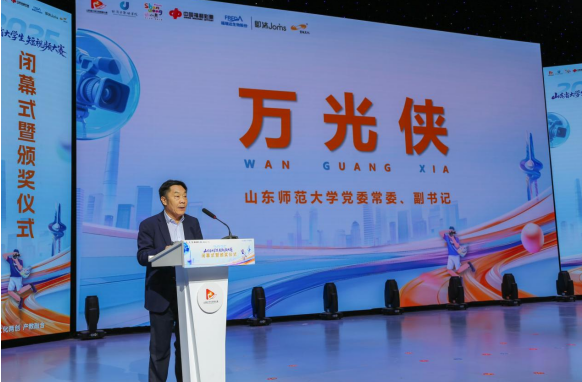 下午2点30分,颁奖仪式在主持人的精彩开场中拉开帷幕。山东师范大学党委副书记万光侠代表主办单位登台致辞。他向与会嘉宾表示欢迎,向支持大赛的各单位表示感谢,向所有获奖学子表示诚挚祝贺。他指出,本次大赛是学校推进产学研深度融合、服务青年成长的重要实践。他强调,短视频是数字时代的文化载体,希望各高校深化实践教学与产学研合作,合作单位持续支持青年成长,更鼓励同学们保持创作热情,用优秀作品讲述山东故事、中国故事,在新时代浪潮中绽放青春光彩。