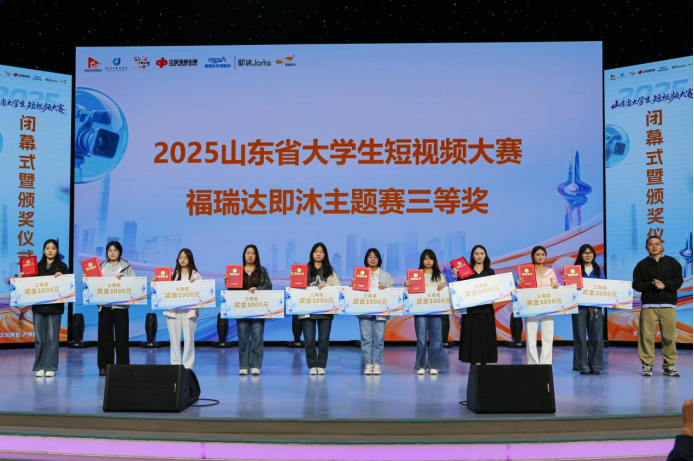2025年11月29日下午,山东师范大学文浚楼演播中心灯光璀璨、掌声雷动,历时数月的2025山东省大学生短视频大赛闭幕式暨颁奖仪式在此隆重举行。本次大赛由山东省新闻传播专业教学指导委员会、山东省广播电视协会、山东省网络视听节目服务行业协会指导,山东师范大学新闻与传媒学院主办,山东寰视文化传播有限公司、山东师范大学品牌传播研究中心承办,山东省旅游推广中心、山东省福利彩票发行中心、山东福瑞达生物股份有限公司联合承办。