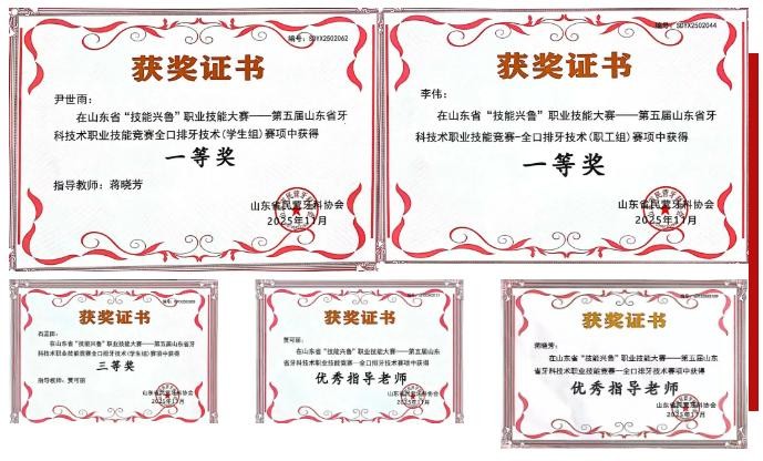 近日,在2025年山东省“技能兴鲁”职业技能竞赛——第五届山东省牙科技术职业技能竞赛中的全口排牙技术赛项中,济南护理职业学院口腔医学系师生斩获佳绩:李伟获职工组一等奖,尹世雨获学生组一等奖,石孟田获学生组三等奖,蒋晓芳、贾可丽获优秀指导教师。