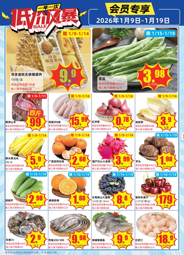 应季蔬果的低价直供,让“菜篮子”拎得更轻快。大润发此次聚焦“鲜”与“省”,冷冻金枕无核榴莲肉仅9.9元/盒,让榴莲爱好者实现“自由”;广西武鸣沃柑2.68元/500g、赣南脐橙1.88元/500g,酸甜多汁的柑橘类水果成为冬日补水首选;云南高山大蓝莓8.8元/盒、智利4J车厘子(2.5千克/箱)179元/箱,高端水果也放下“身段”。就连家常配菜如西葫芦2.98元/500g、红洋葱0.78元/500g,都以“地板价”守护烟火气,让每一餐都新鲜又划算。