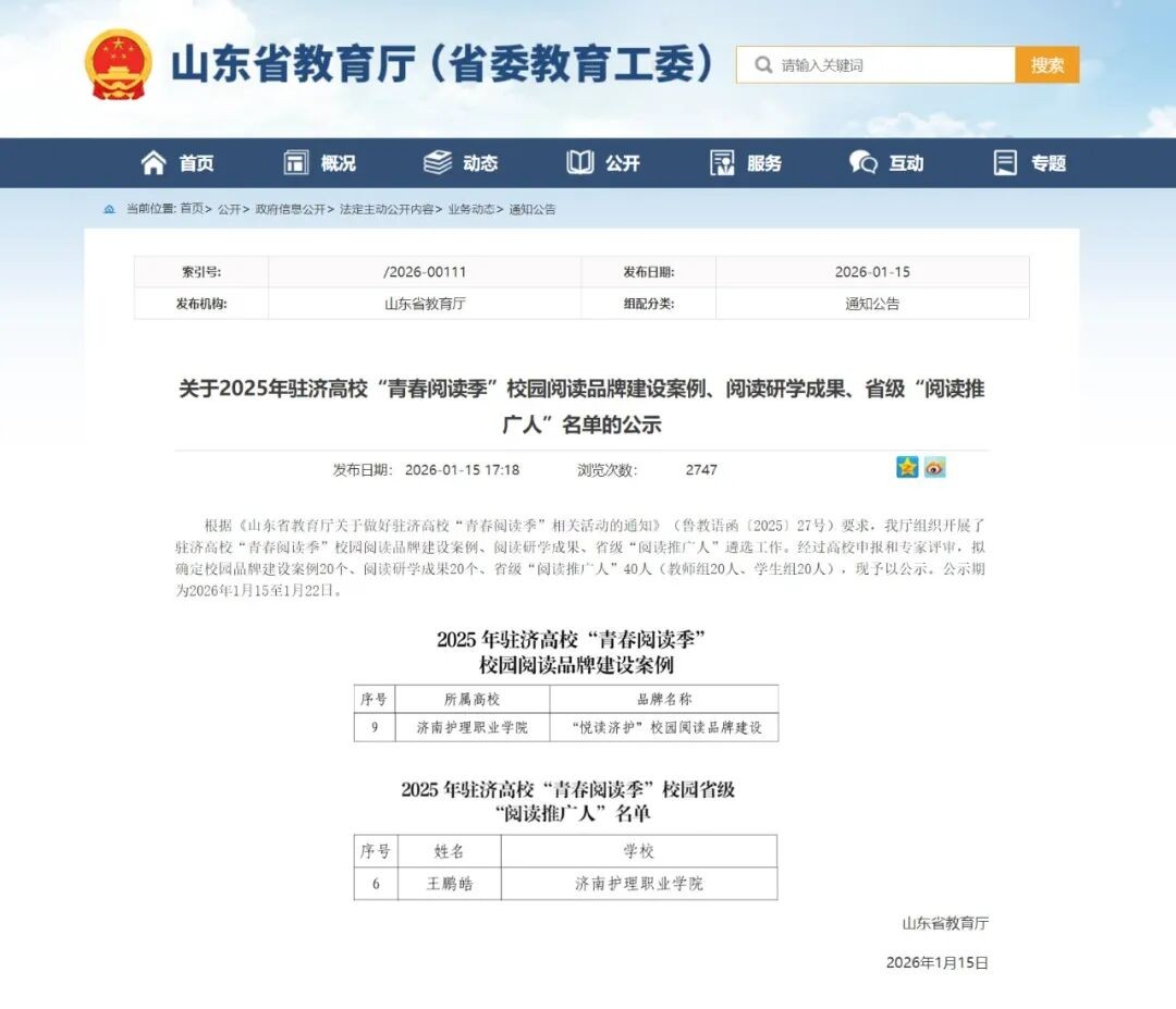近日,省教育厅公布了2025年驻济高校“青春阅读季”校园阅读品牌建设案例及阅读推广人遴选结果。济南护理职业学院报送的《“悦读济护”校园阅读品牌建设情况报告》成功获评优秀案例;同时,24级高药2班王鹏皓同学凭借扎实的阅读推广实践,入选省级阅读推广人。