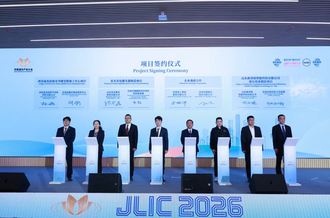 开幕式上,中国光学光电子行业协会理事长应明炯、齐鲁工业大学(山东省科学院)党委书记吴衍涛、中国工程院院士范滇元三位重量级嘉宾分别致辞,从行业发展趋势、产学研协同创新、前沿技术突破等方面分享见解。山东省贸促会党组成员、副会长贺忠军,济南市委常委、统战部部长,市总工会主席张勇强分别作致辞。中国光学光电子行业协会发布《激光安全员岗位规范》团体标准;山东省激光产业促进会发布激光产业“济南宣言”;现场签约多个重点项目,涉及合同总金额超过9亿元,涵盖激光装备制造、新材料、半导体加工等多个领域,项目落地后,将进一步完善济南激光产业链条,增强产业核心竞争力。