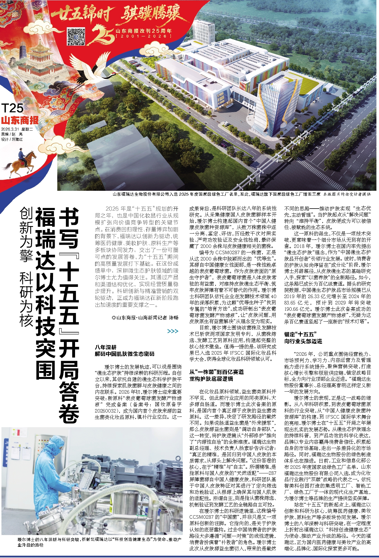 瑷尔博士的表现,正是这一战略的缩影。从八年科研积累,到表皮葡萄球菌原料的行业突破,从“中国人健康皮肤菌种资源库”的构建,到IFSCC国际学术舞台的亮相,瑷尔博士在“十五五”开局之年展现出扎实的发展态势。从微生态护肤理念的持续科普,到产品功效的科学化表达,品牌以专业内容赢得消费者信任,积累起自身的市场基础,走出一条差异化的市场路径。同时,福瑞达生物股份的绿色制造体系也在推进。日前,工业和信息化部公布2025年度国家级绿色工厂名单,山东福瑞达生物股份有限公司入选,成为化妆品行业践行“双碳”战略的代表之一。依托智美科创园打造的集透明工厂、智能工厂、绿色工厂于一体的现代化生产基地,为瑷尔博士等品牌的生产提供坚实保障。