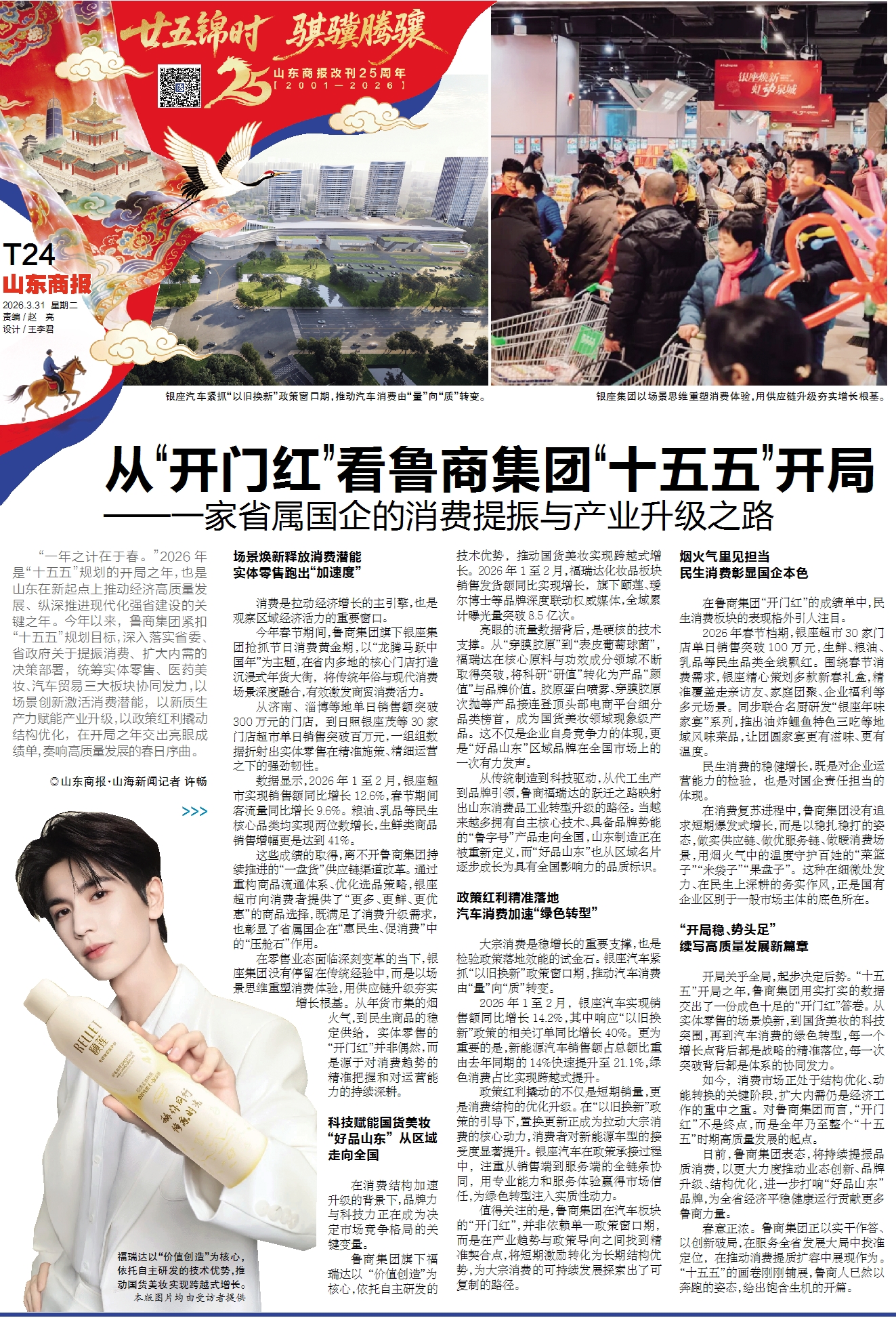 “一年之计在于春。”2026年是“十五五”规划的开局之年,也是山东在新起点上推动经济高质量发展、纵深推进现代化强省建设的关键之年。今年以来,鲁商集团紧扣“十五五”规划目标,深入落实省委、省政府关于提振消费、扩大内需的决策部署,统筹实体零售、医药美妆、汽车贸易三大板块协同发力,以场景创新激活消费潜能,以新质生产力赋能产业升级,以政策红利撬动结构优化,在开局之年交出亮眼成绩单,奏响高质量发展的春日序曲。