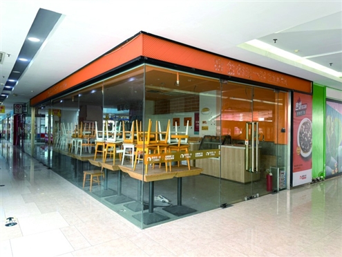 近日,记者实地走访注意到,丁豪广场正常营业,其地下一楼及一楼人流量相对较多,当天来购物的老年群体相对较多,除了带着孩子来商场的老年群体外,还有外卖小哥进进出出,然而,当记者来到三楼时,却发现这里与地下一层和一楼的热闹形成了鲜明对比,美食门店和部分教培商铺大门紧闭,处于闭店状态。