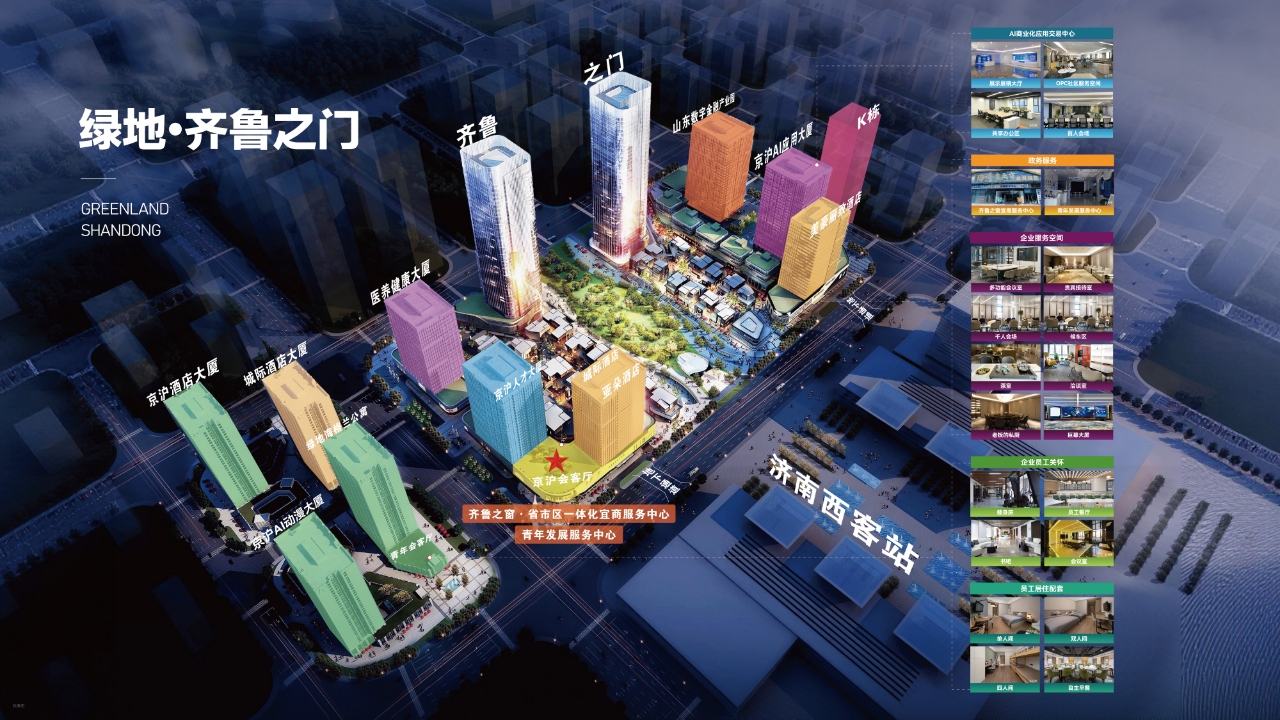 京沪AI应用大厦所属的绿地·齐鲁之门园区是济南西客站片区标志性产业综合体,总建筑面积94万平方米,由13栋现代楼宇组成,涵盖办公、商业、酒店、公寓等多种业态,已入驻企业680余家。