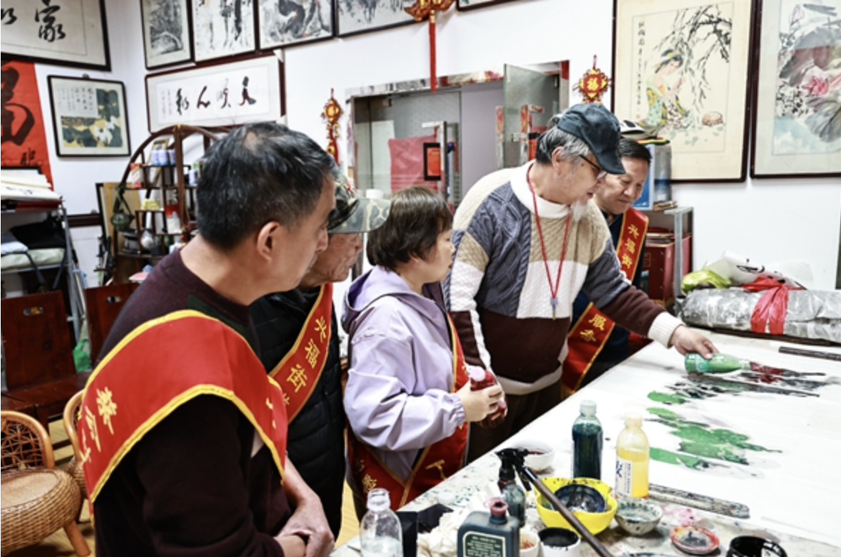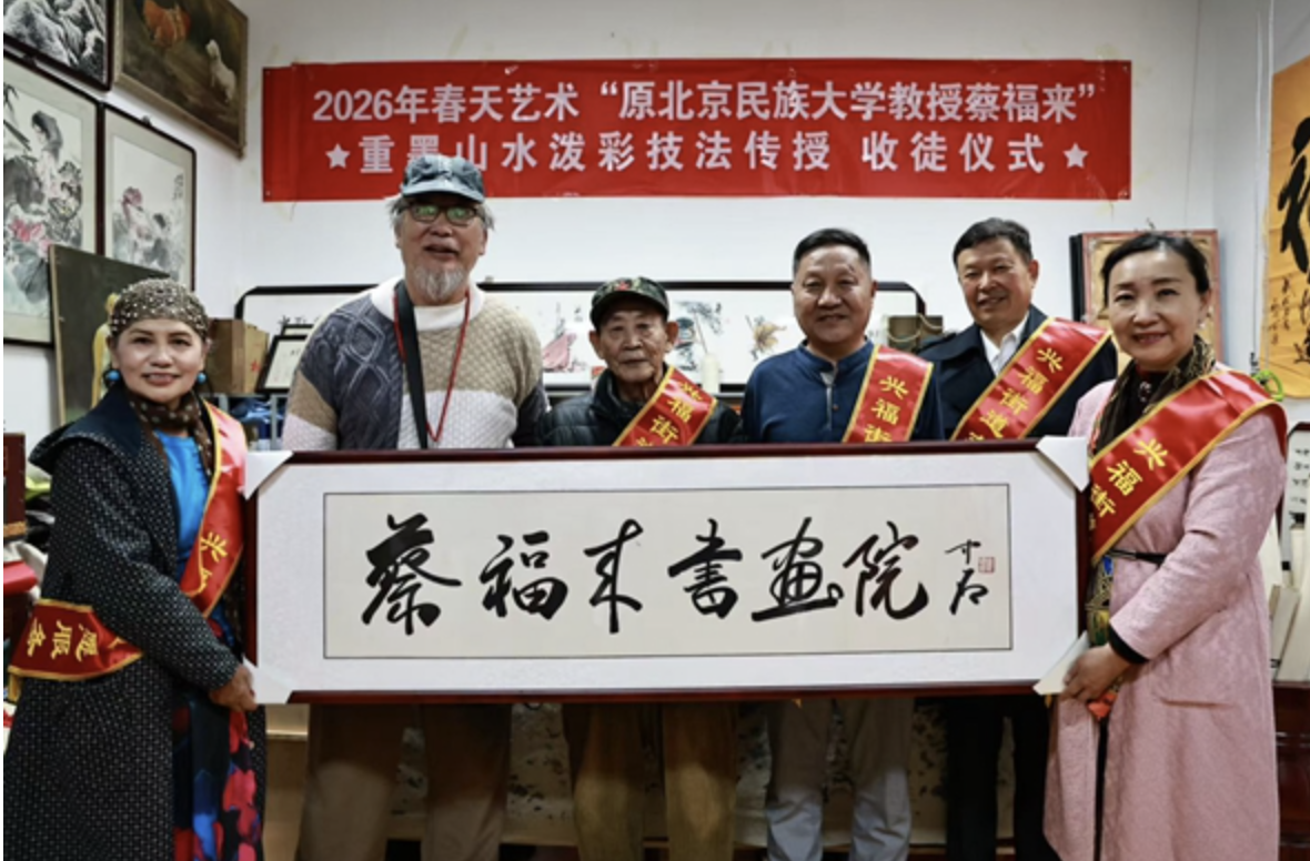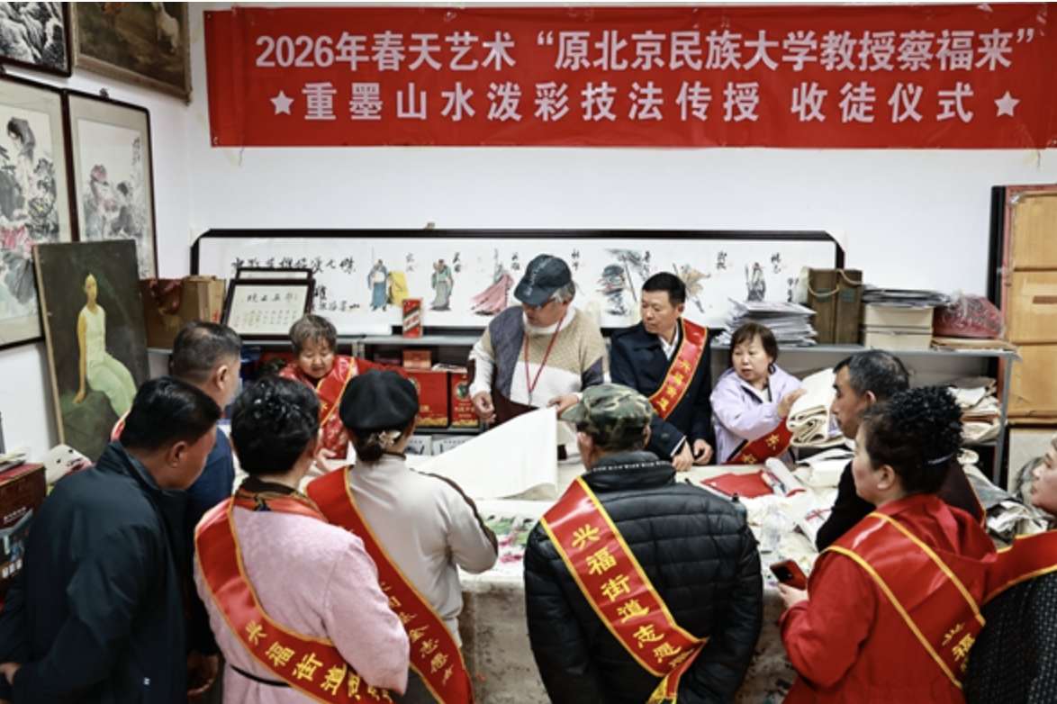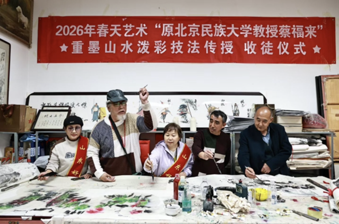 春回大地,墨香启新。2026年春日,济南市槐荫区兴福街道文艺志愿服务团队迎来2026年首场山水画泼墨班授课活动,一场以公益为内核、创新为形式的“重彩山泼墨技法传授收徒仪式”在此温情举行。原北京民族大学教授、山东水浒画派创始人蔡福来摒弃传统拜师仪式的繁琐流程,以艺术讲座与实操示范相结合的方式,完成两位新弟子的拜师纳徒,以“互尊互敬、公益奉献”的全新范式,开启传统书画文化传承与公益事业融合的新篇章。