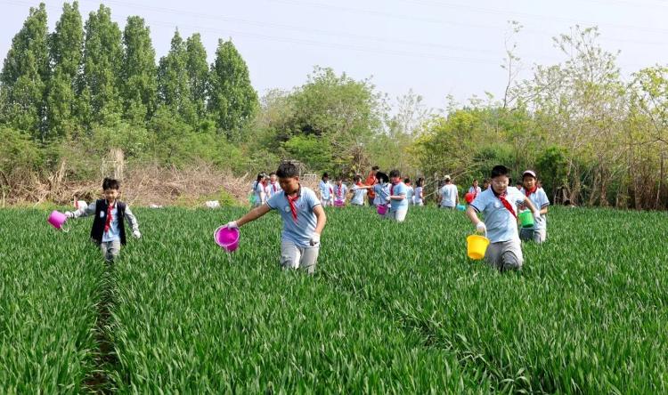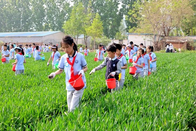 揭牌仪式后,各班学生有序前往田间,开启丰富多彩的实践体验。在“护苗除莠——清除杂草大作战”环节,同学们认真学习小麦拔节孕穗期生长管理知识,亲手拔除田间杂草,在躬身劳作中体悟劳动的艰辛与责任;“厚植根基——科学施肥大挑战”环节,老师们手把手指导学生掌握科学、规范的施肥技巧,让大家以实际行动呵护麦苗茁壮成长;“涓滴成实——润苗接力争霸赛”上,同学们以小组为单位协作完成灌溉任务,在默契配合中凝聚团队向心力,感受团结协作的力量。