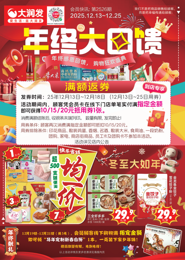 为迎接新年,回馈广大消费者长期以来的支持,零售品牌大润发年末大回馈开启,自2025年12月13日起,全面启动以年终大回馈为主题的大型促销活