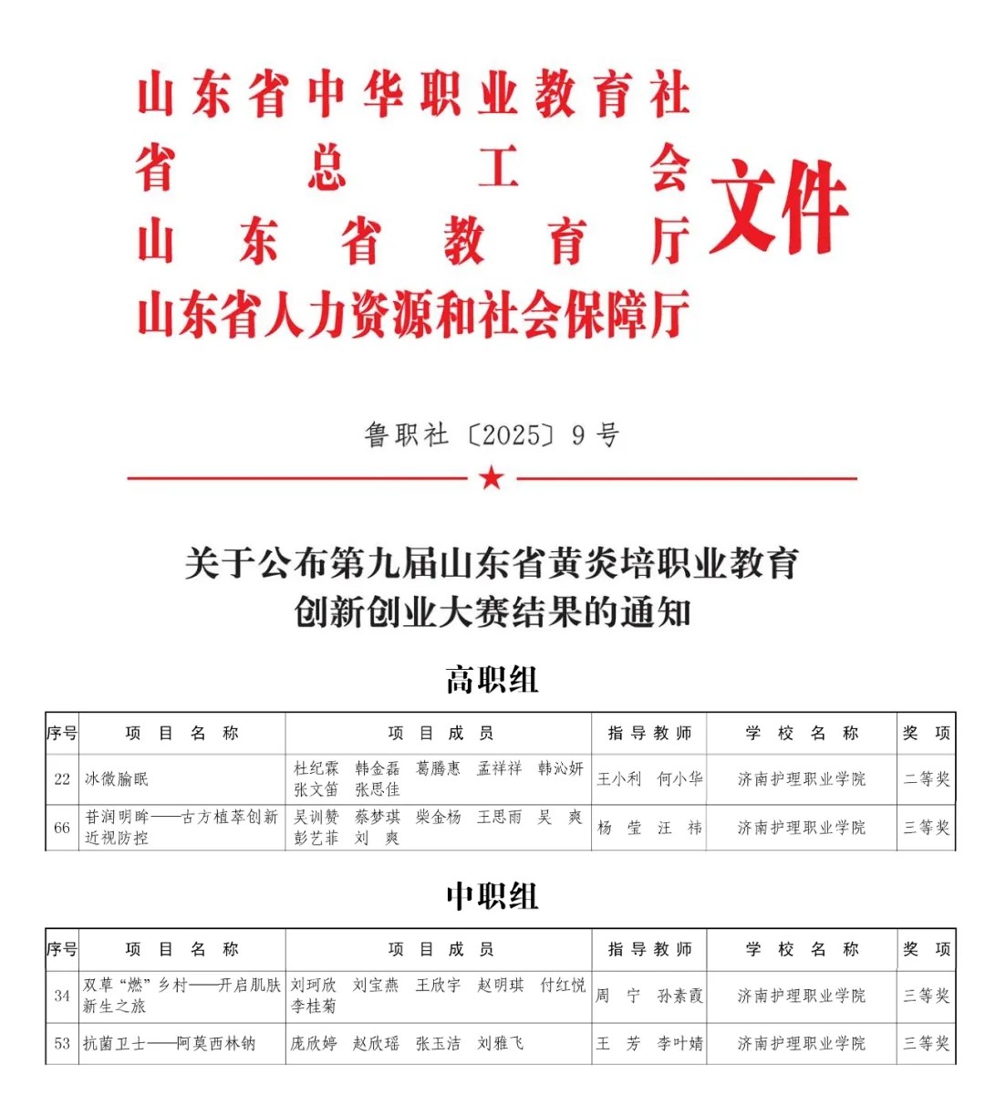 近日,在第九届山东省黄炎培职业教育创新创业大赛中,济南护理职业学院师生团队表现优异,获得二等奖一项、三等奖三项的佳绩,充分展现了济