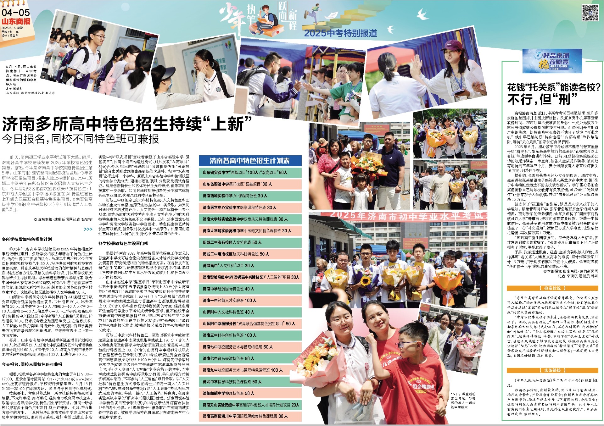 根据《济南市2025年高中阶段学校招生工作意见》,普通高中学校可结合拔尖创新后备人才培养及学校特色发展需要,研究制定相应的特色招生方案。在各校发布的特色招生简章中,记者梳理发现报考要求各不相同,录取上学校也依据以初中学业水平考试成绩为门槛各自设立了不同的要求。