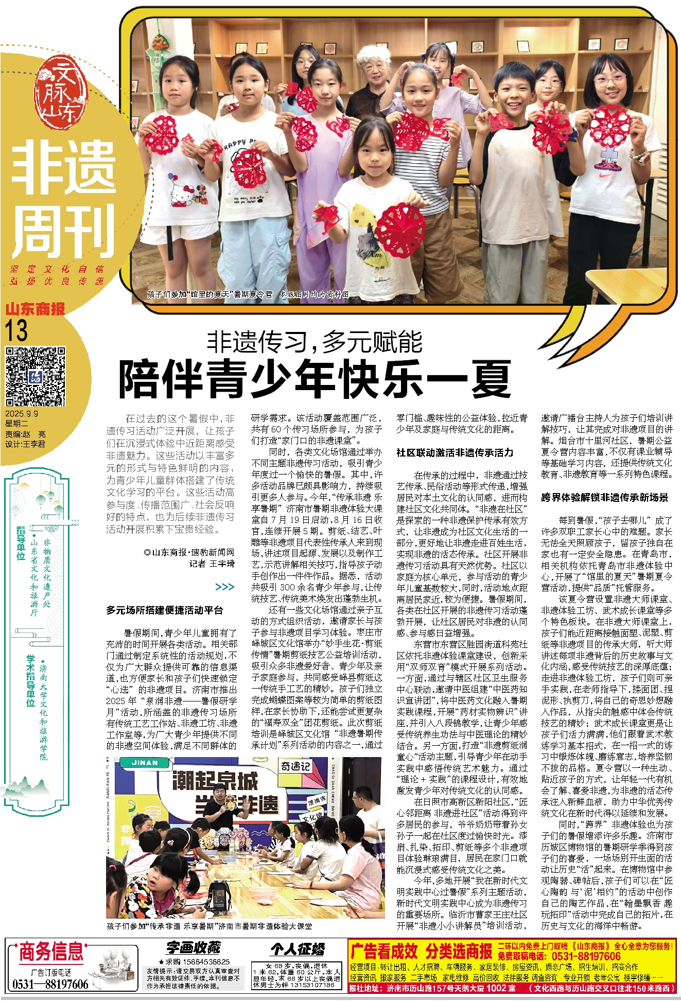 同时,各类文化场馆通过举办不同主题非遗传习活动,吸引青少年度过一个愉快的暑假。其中,许多活动品牌已颇具影响力,持续吸引更多人参与。今年,“传承非遗乐享暑期”济南市暑期非遗体验大课堂自7月19日启动,8月16日收官,连续开展5期。剪纸、结艺、叶雕等非遗项目代表性传承人来到现场,讲述项目起源、发展以及制作工艺,示范讲解相关技巧,指导孩子动手创作出一件件作品。据悉,活动共吸引300余名青少年参与,让传统技艺、传统美术焕发出蓬勃生机。