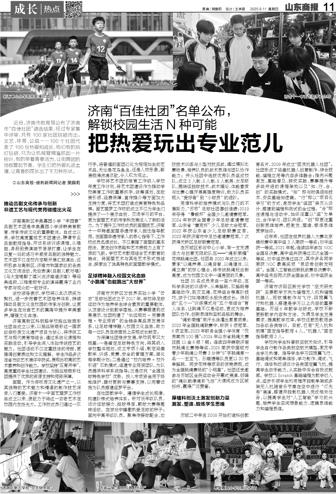 近日,济南市教育局公布了济南市“百佳社团”遴选结果,经过专家集中评审,共有100家社团脱颖而出。文艺、体育、公益……100个社团代表了100份热爱和成长,他们有的挑灯钻研,只为让机械臂精准抓起一片树叶,有的带着青春活力,让街舞团的地板震起节奏,学生们把热爱扎进土壤,让青春的花长出了千万种形状。