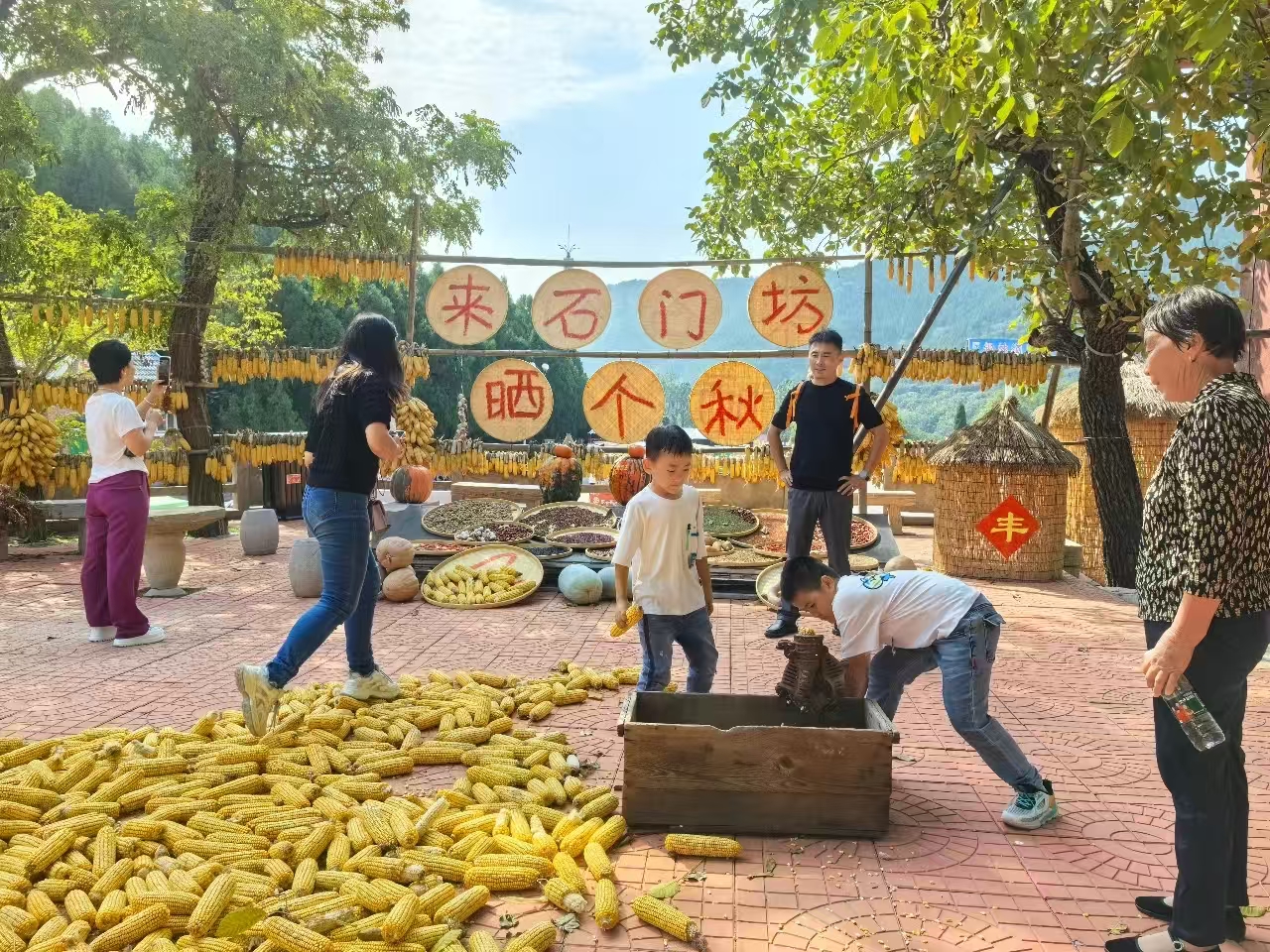 除了醉人的雨中秋景,景区里的热闹更添几分暖意。晒“秋”生活节正火热进行,火红的辣椒、金黄的玉米挂成一道道丰收图景,小朋友们围着老农具好奇打量,大人则忙着与这份乡土气息合影打卡。