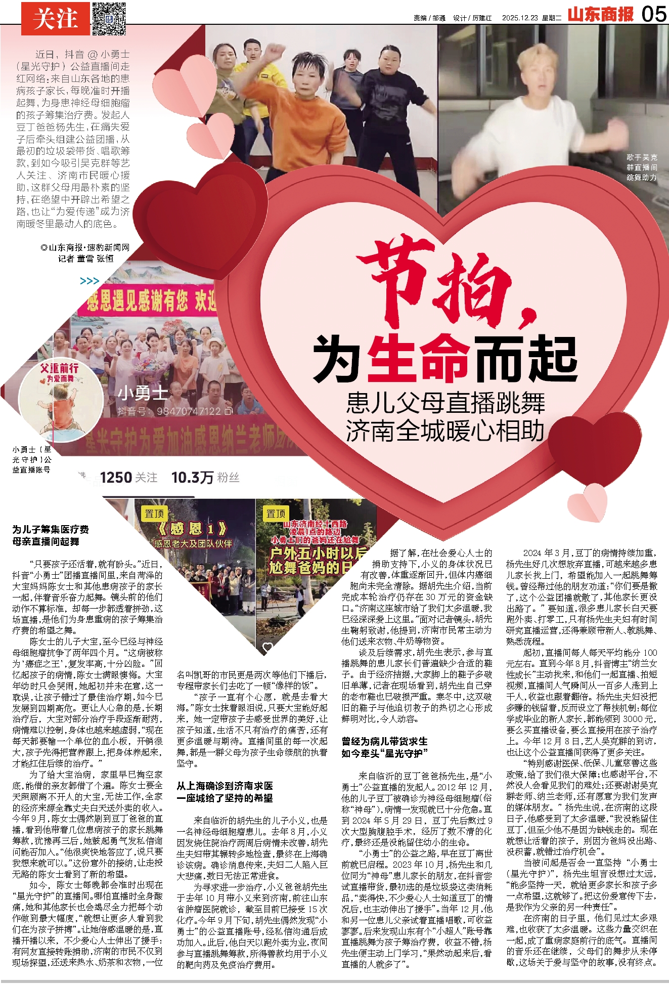 近日,抖音@小勇士(星光守护)公益直播间走红网络:来自山东各地的患病孩子家长,每晚准时开播起舞,为身患神经母细胞瘤的孩子筹集治疗费。发起人豆丁爸爸杨先生,在痛失爱子后牵头组建公益团播,从最初的垃圾袋带货、唱歌筹款,到如今吸引吴克群等艺人关注、济南市民暖心援助,这群父母用最朴素的坚持,在绝望中开辟出希望之路,也让“为爱传递”成为济南暖冬里最动人的底色。