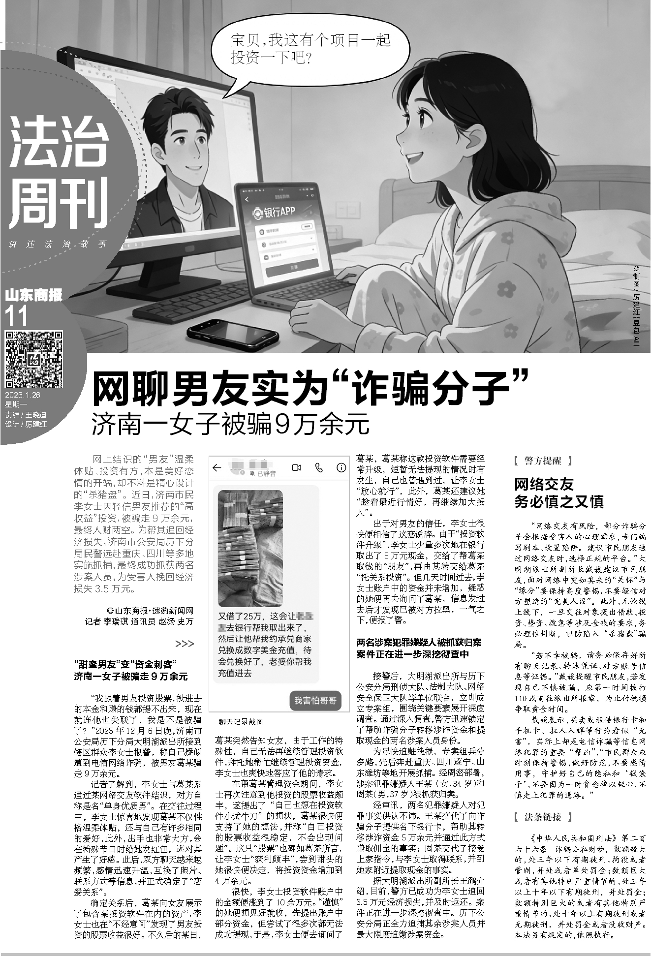 网上结识的“男友”温柔体贴、投资有方,本是美好恋情的开端,却不料是精心设计的“杀猪盘”。近日,济南市民李女士因轻信男友推荐的“高收益”投资,被骗走9万余元,最终人财两空。为帮其追回经济损失,济南市公安局历下分局民警远赴重庆、四川等多地实施抓捕,最终成功抓获两名涉案人员,为受害人挽回经济损失3.5万元。