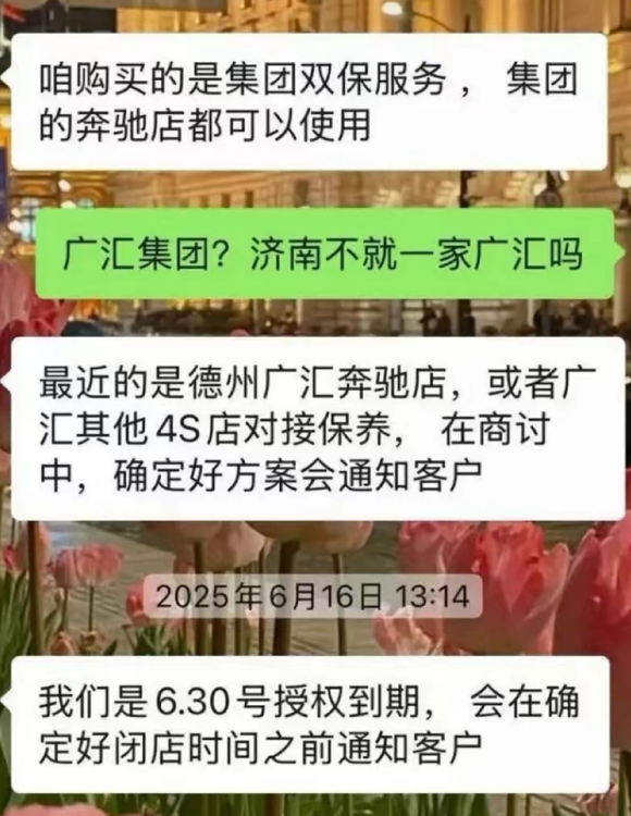 “销售人员当时曾承诺,我们购买的服务可在他们集团旗下的奔驰门店通用,济南车主的权益将迁移至德州广汇之星奔驰店,但谁能想到,一个月之后,德州的4S店也关门了。”刘先生告诉山东商报·速豹新闻网记者,去年7月底,德州广汇之星奔驰4S店同样被终止品牌授权,此前4S店的工作人员也联系不上了。