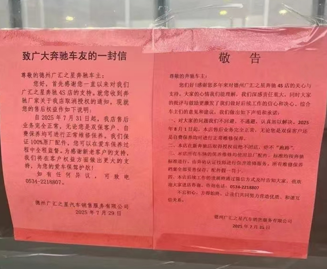 其实,梅赛德斯-奔驰的此类事件并非只出现在山东。据相关汽车行业媒体不完全统计,2025年上半年全国范围内就有超80家奔驰授权经销商终止运营,覆盖23个城市,其中以宝利德、广汇两大集团为闭店重灾区。面对车主的维权诉求,奔驰官方均声称不承担连带责任。