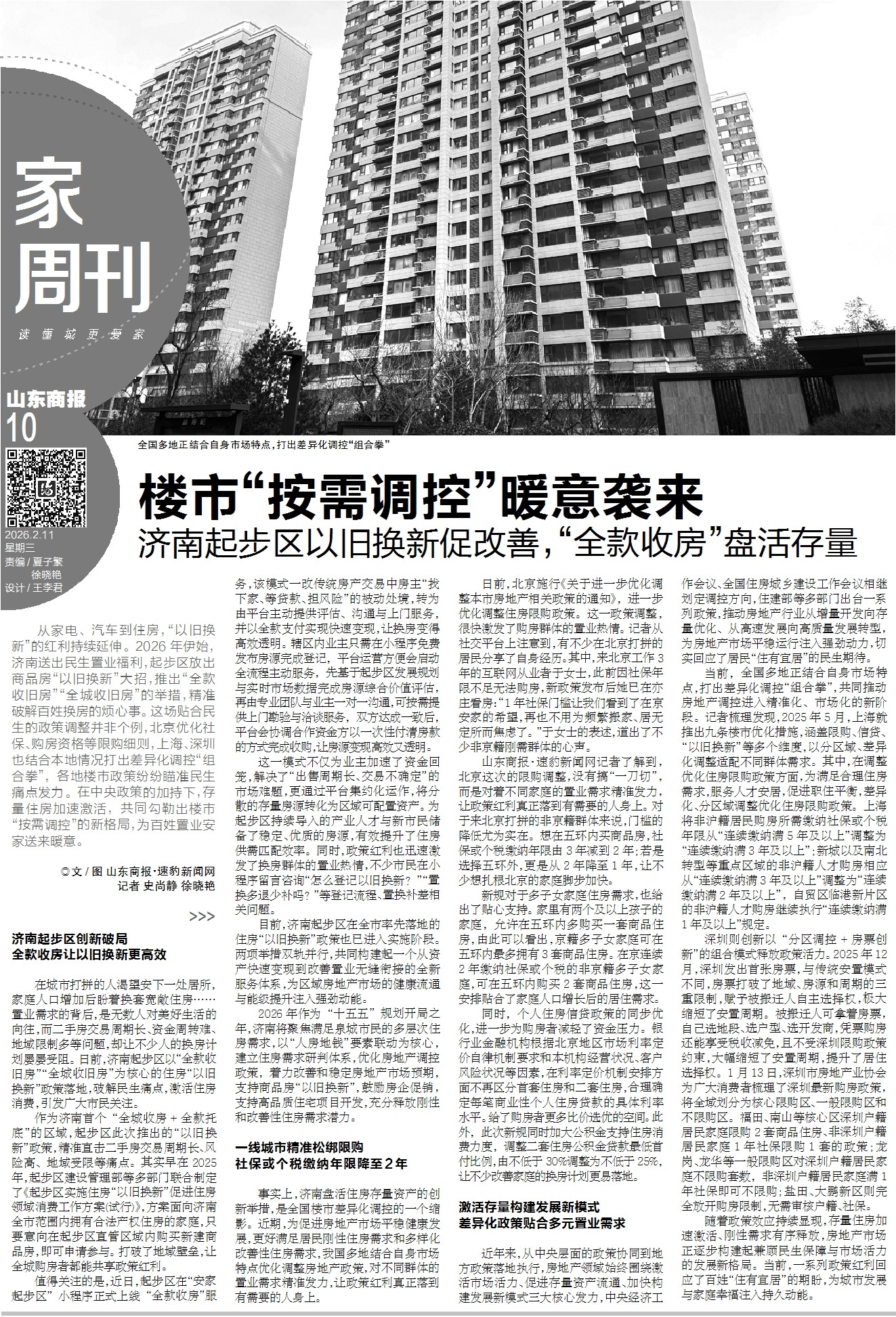从家电、汽车到住房,“以旧换新”的红利持续延伸。2026年伊始,济南送出民生置业福利,起步区放出商品房“以旧换新”大招,推出“全款收旧房”“全城收旧房”的举措,精准破解百姓换房的烦心事。这场贴合民生的政策调整并非个例,北京优化社保、购房资格等限购细则,上海、深圳也结合本地情况打出差异化调控“组合拳”,各地楼市政策纷纷瞄准民生痛点发力。在中央政策的加持下,存量住房加速激活,共同勾勒出楼市“按需调控”的新格局,为百姓置业安家送来暖意。