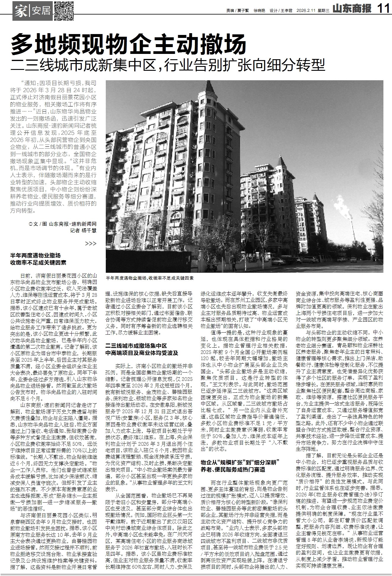 “通知:因项目长期亏损,我司将于2026年3月28日24时起,正式停止对济南假日丽景花园小区的物业服务,相关撤场工作将有序推进……”近日,山东物华尚品物业发出的一则撤场函,迅速引发广泛关注。山东商报·速豹新闻网记者梳理公开信息发现,2025年底至2026年初,从头部民营物企到央国企物业,从二三线城市的普通小区到一线城市的部分业态,全国物企撤场现象正集中显现。“这并非危机,而是市场调节的体现。”有业内人士表示,伴随撤场潮而来的是行业转型的加速,头部物企主动收缩聚焦优质项目,中小物企则纷纷深耕养老物业、便民服务等细分赛道,推动行业向提质增效、质价相符的方向转型。