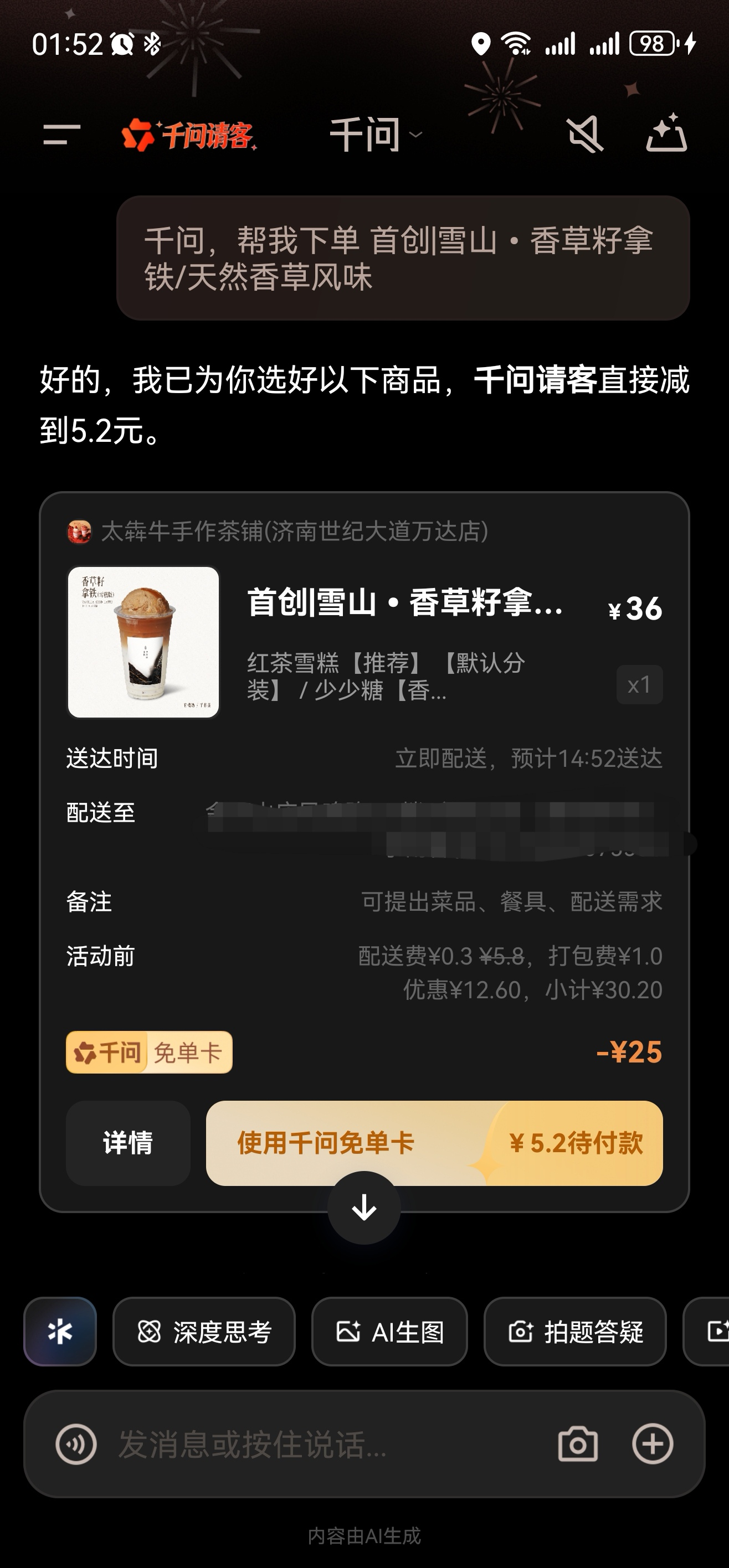 在小孙女的耐心指导下,爷爷奶奶、大伯、姑姑纷纷下载注册千问APP。大家一边学操作,一边感叹科技带来的便利。“千问帮我点全家奶茶。”随着一句简单的语音指令,订单轻松完成。不一会儿,热乎乎的奶茶送到家中,小小的福利,成为团圆年味里的一份甜蜜。