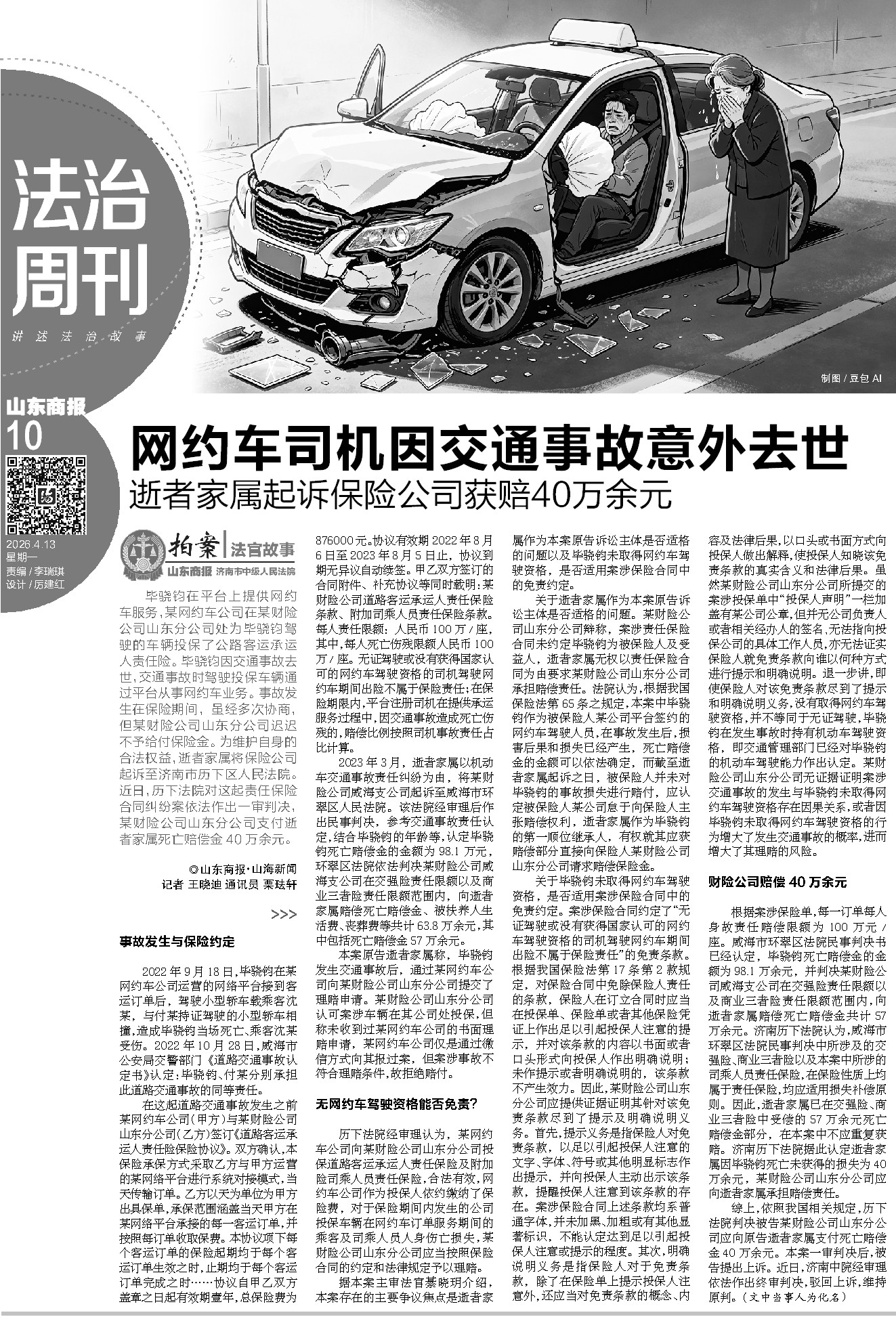毕骁钧在平台上提供网约车服务,某网约车公司在某财险公司山东分公司处为毕骁钧驾驶的车辆投保了公路客运承运人责任险。毕骁钧因交通事故去世,交通事故时驾驶投保车辆通过平台从事网约车业务。事故发生在保险期间,虽经多次协商,但某财险公司山东分公司迟迟不予给付保险金。为维护自身的合法权益,逝者家属将保险公司起诉至济南市历下区人民法院。近日,历下法院对这起责任保险合同纠纷案依法作出一审判决,某财险公司山东分公司支付逝者家属死亡赔偿金40万余元。