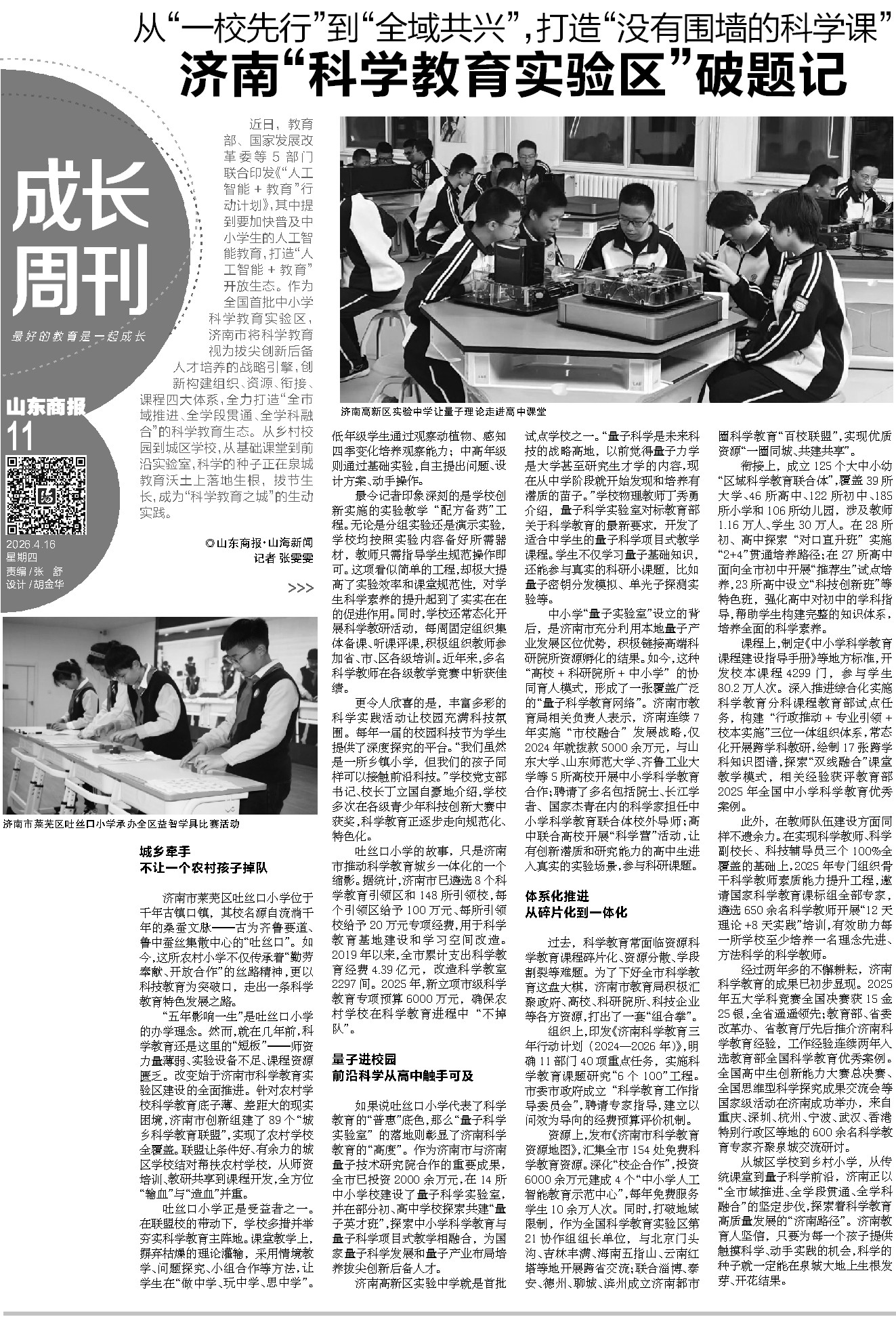从城区学校到乡村小学,从传统课堂到量子科学前沿,济南正以“全市域推进、全学段贯通、全学科融合”的坚定步伐,探索着科学教育高质量发展的“济南路径”。济南教育人坚信,只要为每一个孩子提供触摸科学、动手实践的机会,科学的种子就一定能在泉城大地上生根发芽、开花结果。