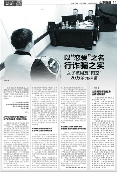 “这场恋爱期间的大额转账,已经符合构成诈骗罪的要件。”刘国华告诉记者,即使双方存在恋爱关系,只要行为人以非法占有为目的实施欺骗并取得财物,便仍可能构成诈骗罪。相关法律明确指出,构成诈骗罪需满足三个条件,即以非法占有为目的;虚构事实或隐瞒真相;骗取数额较大财物。