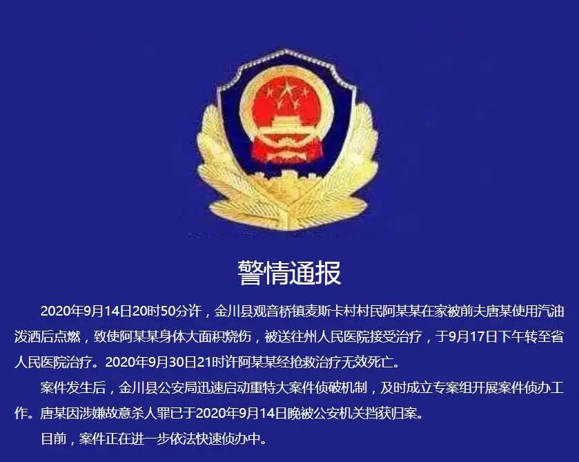 案件发生后,金川县公安局迅速启动重特大案件侦破机制,及时成立专案组开展案件侦办工作。唐某因涉嫌故意杀人罪已于2020年9月14日晚被公安机关挡获归案。