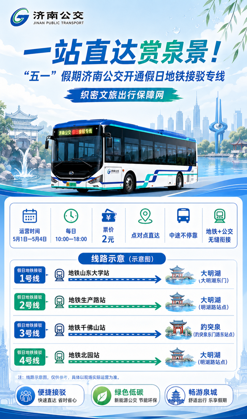 “五一”假期来临,趵突泉、黑虎泉、大明湖等核心景区及周边商圈将迎来客流高峰,济南公交精准研判客流特点,开通4条假日地铁接驳专线,采用点对点直达运营模式,中途不设置停靠站点,实现地铁出站口与景区入口无缝连通,大幅缩短游客步行距离,全面提升假日文旅出行体验。