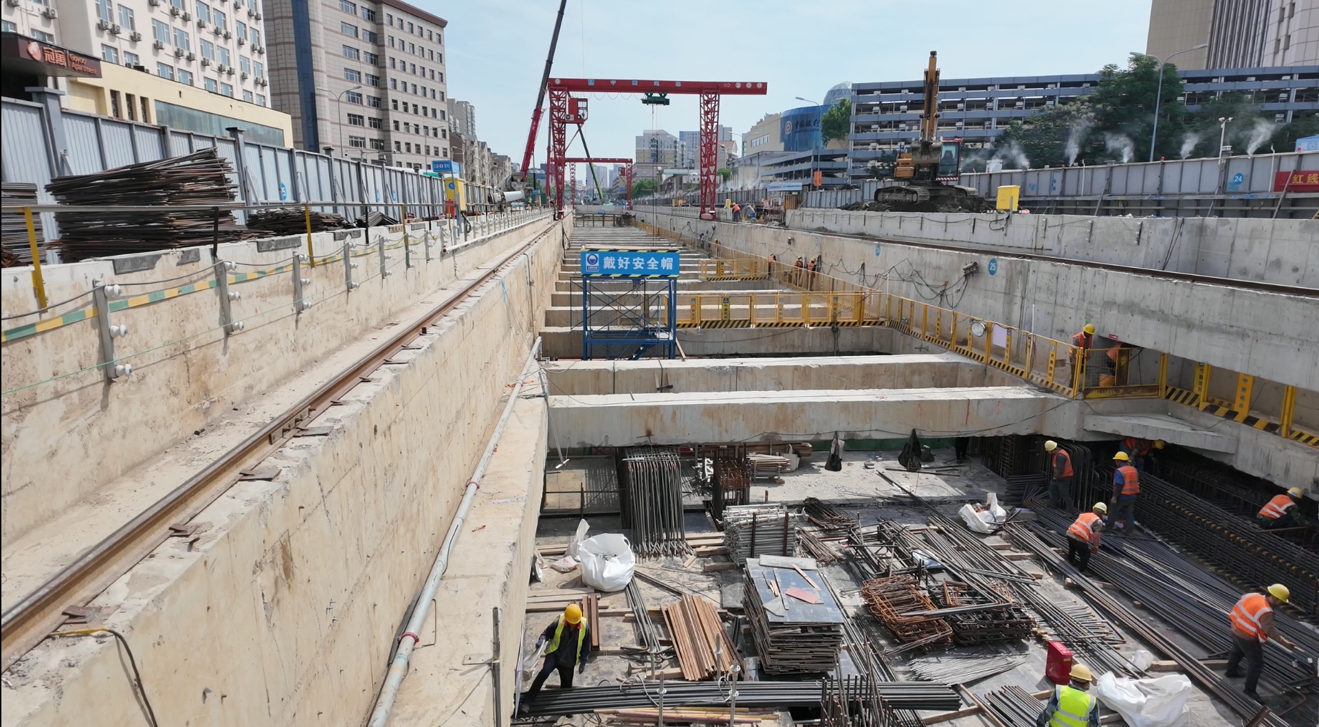 “现在位于的是全线自南向北第十一个车站的洪家楼站,作为重要的盾构过站车站,这里承担着花园路站方向盾构始发与洪楼广场站方向盾构接收的双重任务,是全线贯通的关键节点之一。”据李强介绍,为了安全高效地完成工作,数百名作业人员及现场管理人员不辞辛劳,马不停蹄地防水铺设、钢筋绑扎、模板支设、混凝土浇筑……各道工序有条不紊地交叉推进。