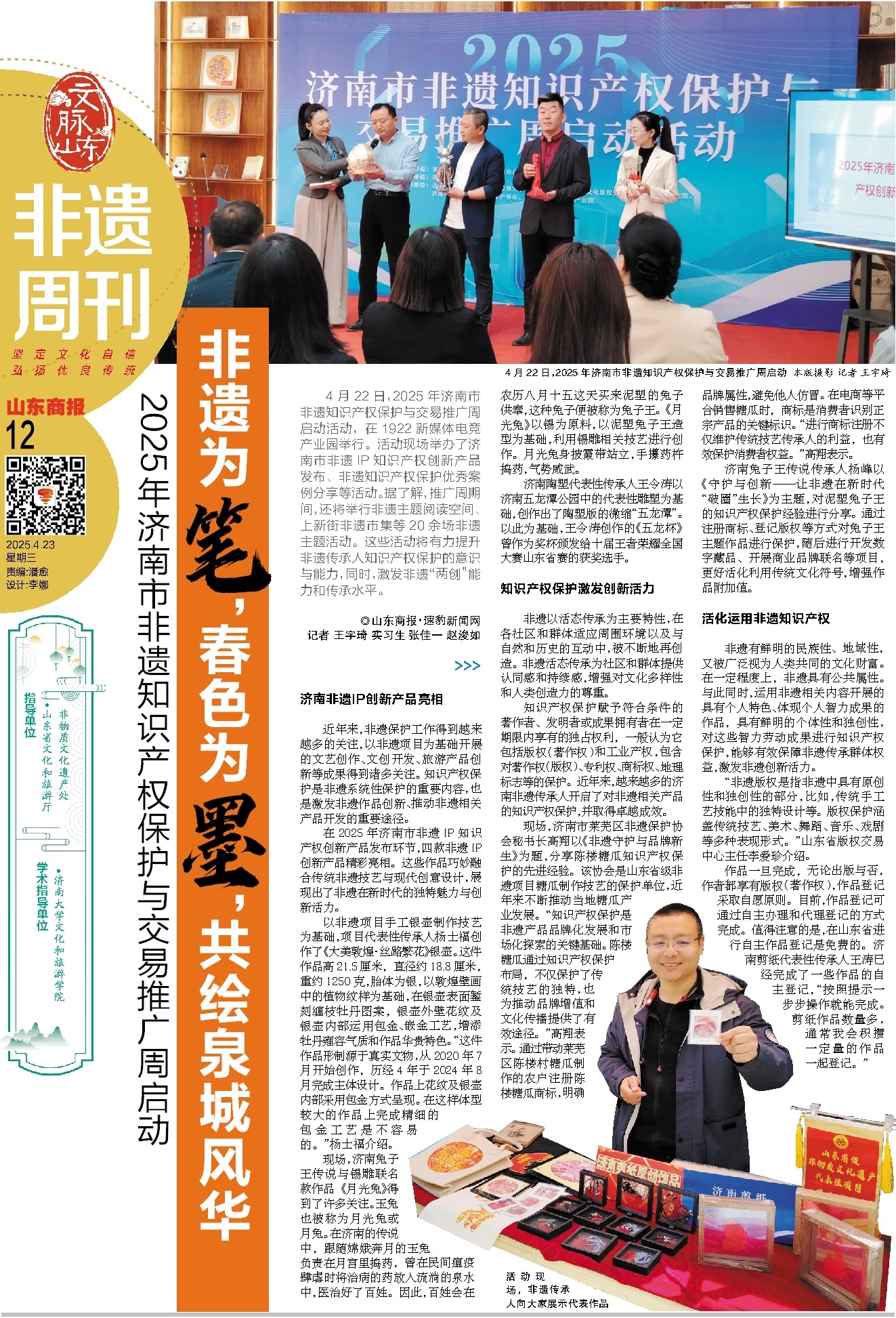 4月22日,2025年济南市非遗知识产权保护与交易推广周启动活动,在1922新媒体电竞产业园举行。活动现场举办了济南市非遗IP知识产权创新产品发布、非遗知识产权保护优秀案例分享等活动。据了解,推广周期间,还将举行非遗主题阅读空间、上新街非遗市集等20余场非遗主题活动。这些活动将有力提升非遗传承人知识产权保护的意识与能力,同时,激发非遗“两创”能力和传承水平。