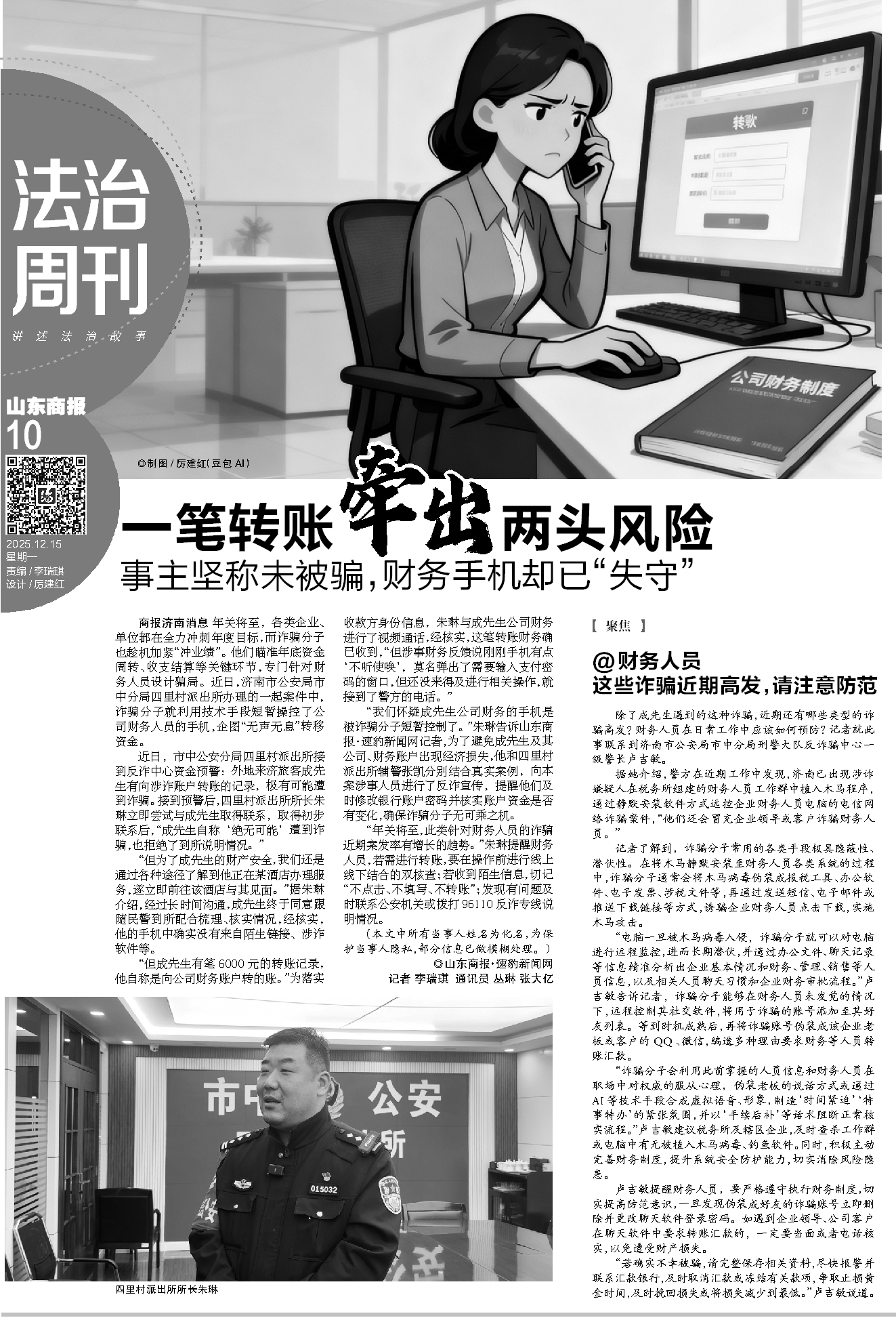“我们怀疑成先生公司财务的手机是被诈骗分子短暂控制了。”朱琳告诉山东商报·速豹新闻网记者,为了避免成先生及其公司、财务账户出现经济损失,他和四里村派出所辅警张凯分别结合真实案例,向本案涉事人员进行了反诈宣传,提醒他们及时修改银行账户密码并核实账户资金是否有变化,确保诈骗分子无可乘之机。