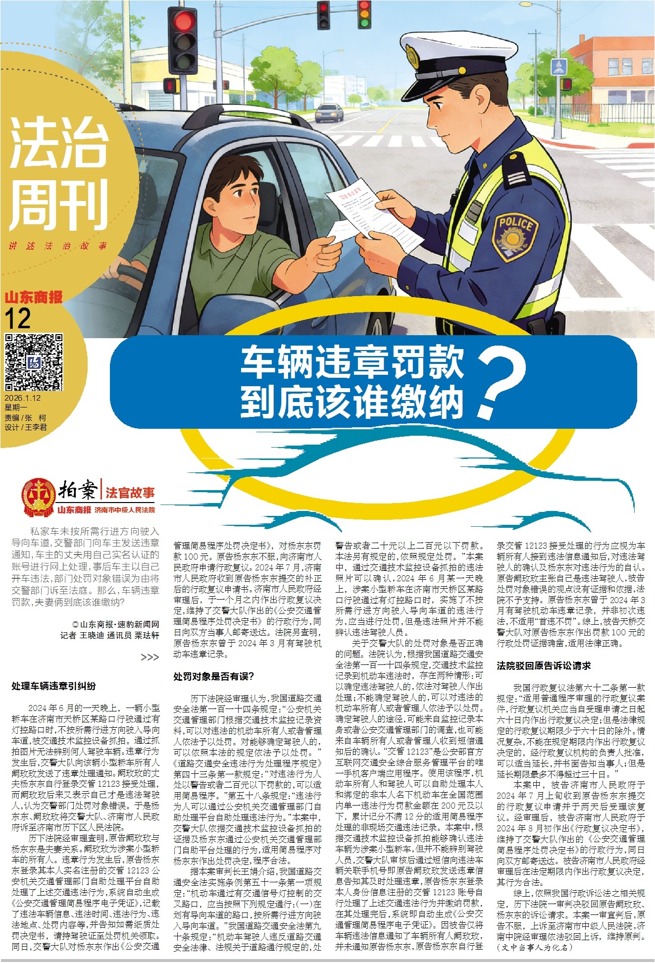 2024年6月的一天晚上,一辆小型轿车在济南市天桥区某路口行驶通过有灯控路口时,不按所需行进方向驶入导向车道,被交通技术监控设备抓拍。通过抓拍图片无法辨别何人驾驶车辆。违章行为发生后,交警大队向该辆小型轿车所有人阚玫玫发送了违章处理通知。阚玫玫的丈夫杨东东自行登录交管12123接受处理,而阚玫玫后来又表示自己才是违法驾驶人,认为交警部门处罚对象错误。于是杨东东、阚玫玫将交警大队、济南市人民政府诉至济南市历下区人民法院。